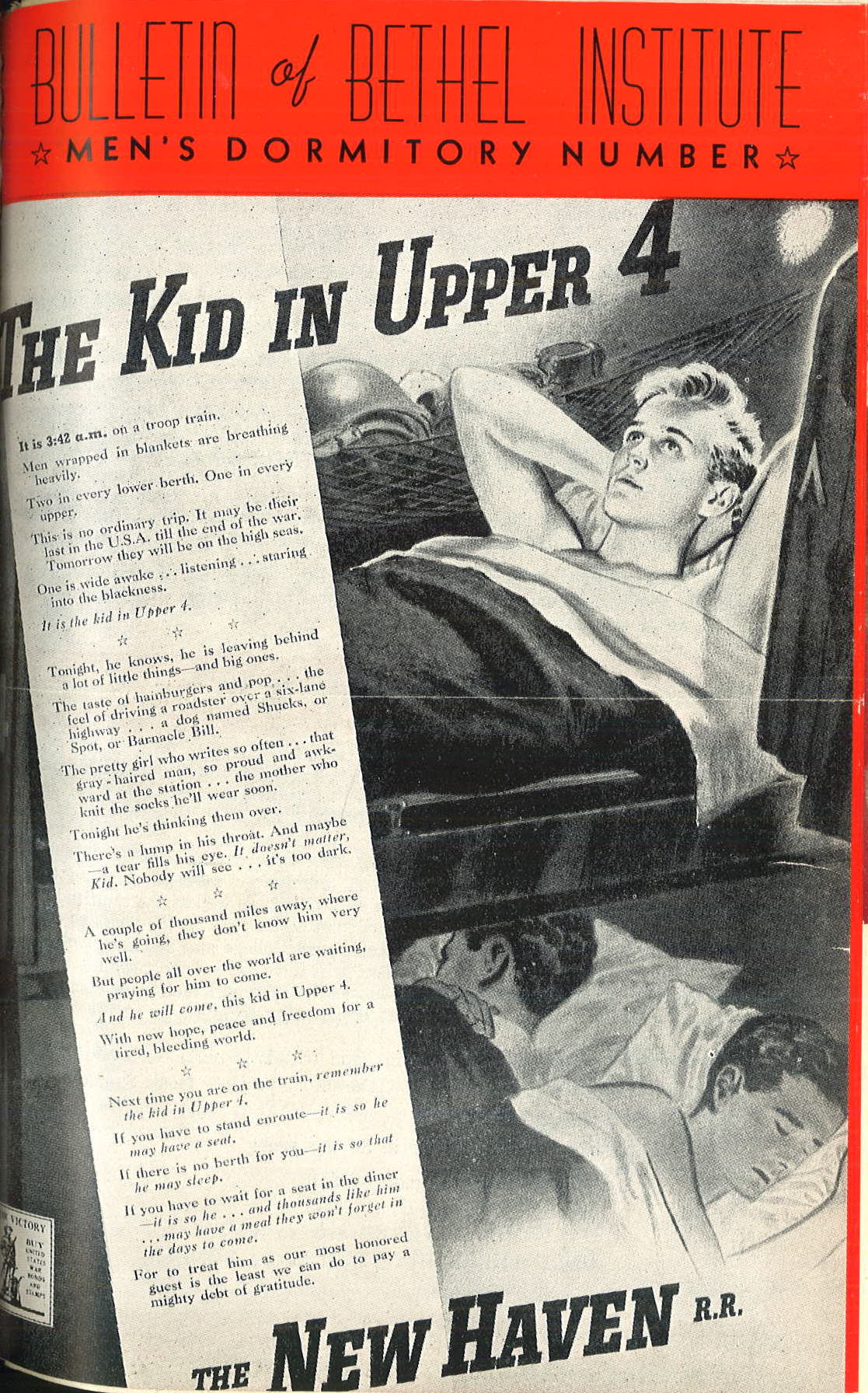 A pioneering example of the advertising “strategy of deflecting negative attention away from a product or service,” according to semiotics scholar Marcel Danesi, Metcalf’s strategy “worked beyond expectations,” with rail use increasing after it appeared and the ad then used to sell everything from war bonds to… a fundraising campaign for a small Baptist junior college in Minnesota seeking to provide comfortable sleeping accommodations for young men.