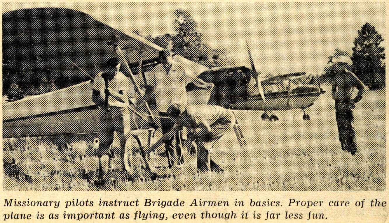 By 1964, the photos accompanying Brigade features had changed. Gone were civilian clothes; in their place were full, military-style uniforms complete with medals, badges, and ties. The bible memorization and spiritual emphasis of the earlier program continued, but was supplemented by new additions: camping, outdoor survival skills, and aircraft maintenance. While that latter activity was billed as an essential skill for a missionary pilot to have, it’s a little eerie to see knowing that some of the boys pictured may well become mechanics in Vietnam; the juxtaposition between the quasi-military nature of the scene and the civilian mundanity of task at hand reminds me of a still from Leni Riefenstahl’s 1935 film, Triumph of the Will which similarly mixes civilian and militaristic themes.