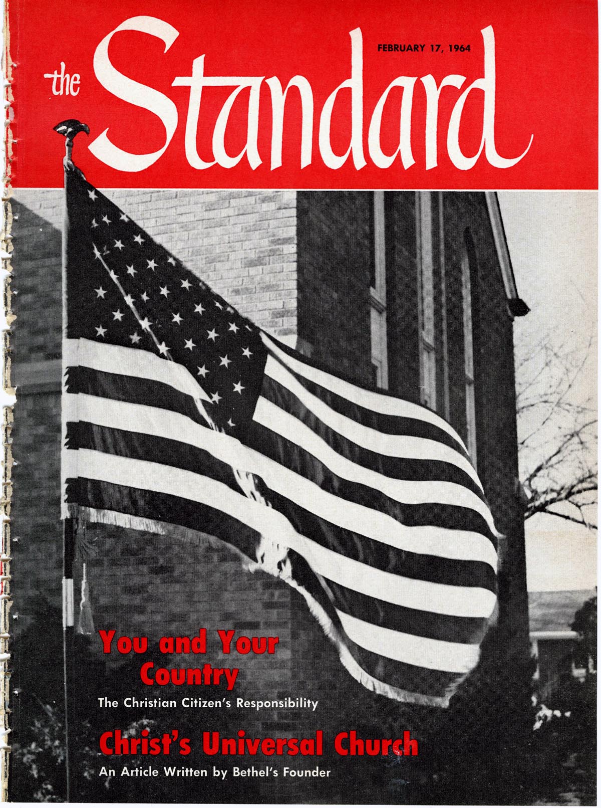 In the mid 1960s, the Conference was still evincing strong patriotism as a hallmark of its religious style. The cover of the February 17, 1964 Standard depicted an unfurled American flag, and on the inside cover a poem by Kenneth Carlson. Carlson’s poem quoted the fourth stanza of “My Country ‘Tis of Thee” and connected it’s plea for divine grace to an exhortation to national pride: “This stanza […] is a prayer. It is a plea, a declaration of faith, a reminded of God’s goodness and of our dependence upon Him. It is a call for continuing patriotism.”¹¹ Carlson concluded the article by arousing patriotic fervor with a recited litany of Americana from Bradford and the Pilgrims’ survival in the Massachusetts wilderness and Washington’s perseverance at Valley Forge to the Gettysburg Address.