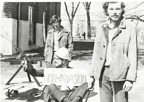 But for Fagerson the Moratorium statement was only the beginning of a series of escalating antiwar incidents. In early May 1970, Fagerson participated in what he called a “theater bit” opposing the Nixon-ordered incursion into Cambodia. The “bit” was documented in the Clarion coverage of the Cambodian invasion protests at Bethel and in the 1970 yearbook. Fagerson and several students staged a “non-invasion invasion” in mockery of the Nixon administration’s defense of the Cambodian campaign. Drawing each other in wagons, Fagerson and his students marched around the campus, holding signs and carrying fake guns. The professor himself brandished a machine gun.
