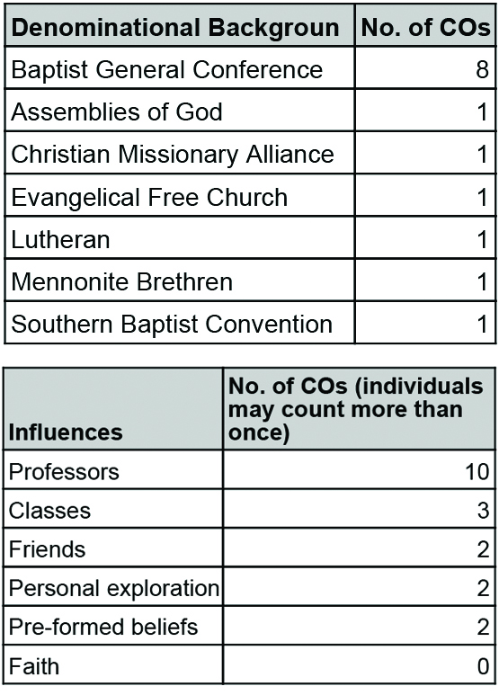 Demographically, the Bethel COs reveal few surprises. The thirteen men whose applications could be dated with some level of confidence show that Bethel’s CO activity began in 1968, peaked in 1970-71, and ended (at least those COs relevant to the Vietnam era) in 1975. This pattern roughly mirrors the data John Hagan has collected on draft evaders in Canada — albeit shifted by three years: a rapid climb, peak, then a gradual lessening in the numbers.⁶² The church backgrounds of the COs are somewhat more interesting. Eight of fourteen indicated backgrounds in the Baptist General Conference — unsurprising given the predominance of that denomination among Bethel’s student population — while one each mentioned experience in the Assemblies of God, Christian and Missionary Alliance, Evangelical Free Church, (unspecified) Lutheran church, Mennonite Brethren, and Southern Baptist Convention. Church backgrounds become somewhat more interesting when considering various motivations the COs expressed for their decision. By tabulating the different influences COs mentioned in response to an item on the Broughton survey (item 4, “Describe what influence, if any, a counselor at Bethel had upon your CO status”), we can arrive at a rough measure of the kinds of motivations students experienced. With ten incidences, Bethel professors were clearly the most influential on the students’ decisions to file for CO status. Classes and classwork were mentioned three times, and friends, personal exploration, and pre-formed beliefs were each mentioned twice. No student mentioned faith as an influence on how they arrived at their CO decision; it is probable that students assumed this influence so strongly that they did not mention it in their survey answers. Two students who indicated their CO beliefs were fully formed by the time they arrived at Bethel — Roger Wiens and Ken Rizzuti — perhaps not incidentally, were the same two who indicated a background in the Mennonite Brethren, one of the historic peace churches.