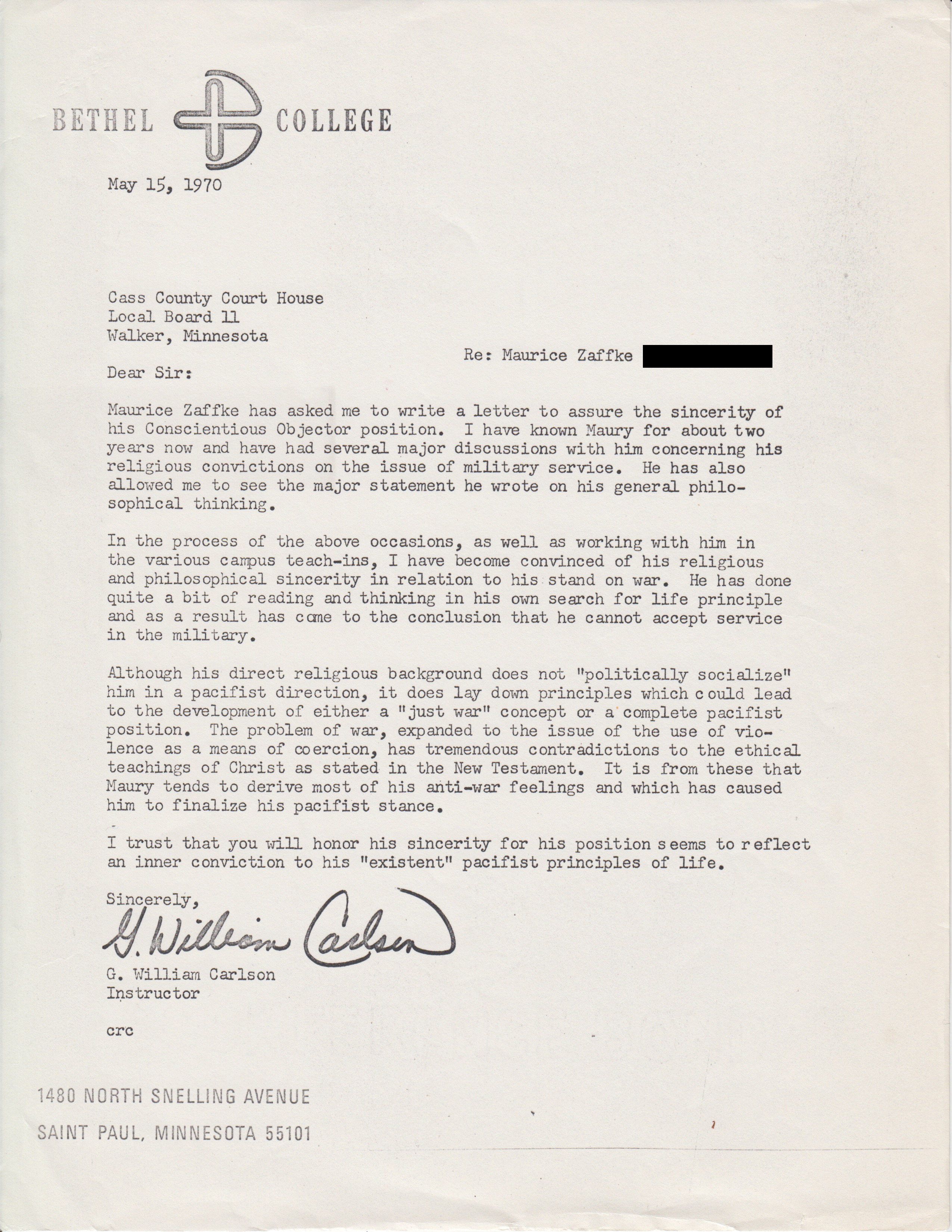 The documents which form the basis of our knowledge of the Bethel COs require some explanation. As evident from his quotations throughout this article, G. William Carlson has been an invaluable source for information about Bethel during the Vietnam era. As a student from 1961-65, then as a professor of varying ranks from 1968 until his quasi-retirement in 2012 (he has taught at least one course every semester since), there are few people with a deeper institutional memory than Carlson. And as an historian and political scientist, Carlson is uniquely placed to document Bethel’s history. The basement of his house in Saint Paul contains his legendary library and files and rivals The History Center at Bethel. Thus, when I began researching the COs at Bethel, Carlson was the first person I turned to. In addition to the two hour interview he granted, Carlson dropped into my hands several thick folders of material, including his complete file of letters written to draft boards in support of CO applicants, a file of CO statements students had written for their applications, a set of surveys of Bethel COs conducted by Cedric Broughton, a student who researched the draft at Bethel in 1976, and Cedric’s completed paper.