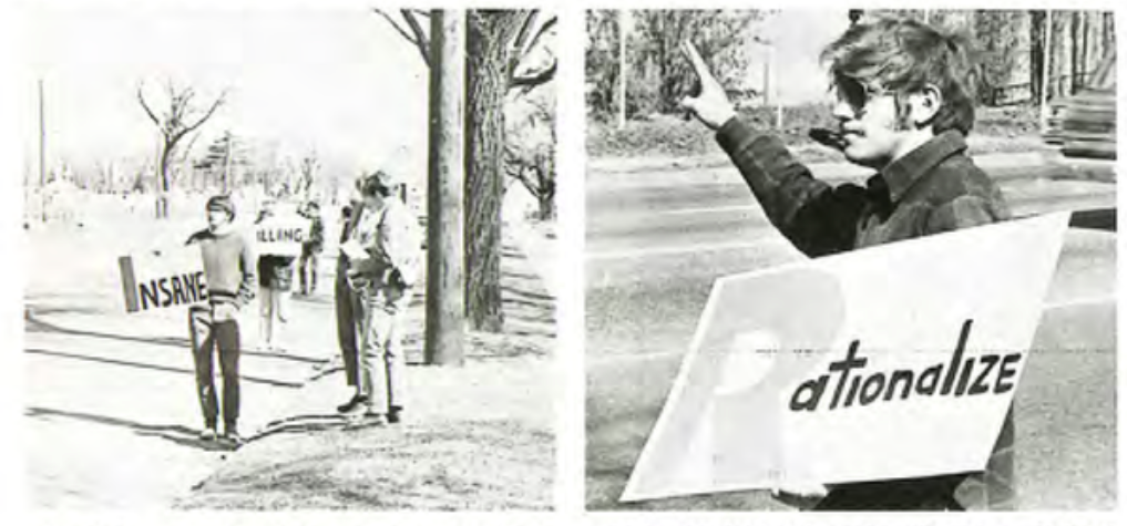 While the documentary record of the period does not suggest that the draft played as pivotal a role as Carlson contends, the draft was clearly a major force in students’ lives and pervaded campus culture from 1966 to 1970. Demonstrating the gallows humor that the draft inspired, a farcical essay from November 1966 narrated the author’s fictitious descent into an insane asylum as he prepared for final exams. After missing several classes and losing a girlfriend to his roommate, the author was informed by the local draft board that his student deferment had expired; his grades were too low. Finally launched into madness by the unpalatable dorm food, the piece ends on a high note: “I’m really fine now. They are going to let me out this afternoon. They have to. I’ve been drafted.”⁵ More seriously, a 1967 campus poll revealed that students ranked civil rights and Vietnam as leading national problems. The men, uniquely, were inclined toward concern for the draft.⁶