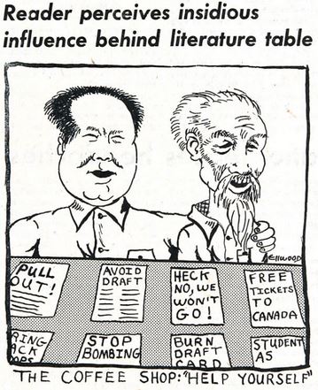Between the fall of 1966 and the spring of 1967, some evidence of discontent of the draft began to appear at Bethel. In October, the Clarion published a two article series released by the Collegiate Press Service, an AP wire-type journalism service for college newspapers. The series, written by Roger Rapoport, documented the increasing trend of young Americans migrating to Canada to avoid the draft. The first article followed Bob Thomas (not his real name) from graduation and I-A status through his decision to migrate and his experiences since. “‘From up here,’” the article quoted Thomas saying, “‘America really looks like it’s going nuts… it’s on its way to a collective nervous breakdown.’” Once in Canada, Thomas found a job at the University of Toronto with the help of the Student Union for Peace Action, a Canadian affiliate of Students for a Democratic Society (SDS). In spite of his opposition to the Vietnam War (“I think if I was in North Viet Nam I might join up. Ho is far superior to Ky”), Thomas claimed his decision was not politically motivated: