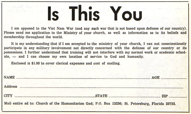 The single exception to this pattern of argumentation was Maurice Zaffke. While other CO statements were between two and five pages, Zaffke’s statement ran to fifteen typewritten pages. The statement eschewed the kind of detailed, exegetical argumentation the others prefered and opted for a grand (and somewhat sophomoric, if not uninteresting) exposition on the purpose of the church and its relation to modern society. Drawing heavily on the German theologian Dietrich Bonhoeffer, with smatterings of W.B. Auden, Paul Tillich, and Bob Dylan, Zaffke wove a complicated indictment of modern society using the full language of the Christian Left. Zaffke attacked “American Religion” as a materialist, corrupted enterprise, enslaved the military industrial complex and sold out to the values of the world. Using four characterizations of the worst elements of American Religion — its tendency to treat God as the Deus ex Machina, its willingness to relegate God to the gaps of human understanding, its eagerness to treat God as a “majesty object,” and its acceptance of cheap grace which resulted in the “decadence of personal salvation” — Zaffke pitted it against his conception of the true Church, the “community of cooperation.” Evidently, Zaffke’s notion of cooperation extended far beyond ecclesial matters. His essay quickly launched into a critique of capitalism, (unwittingly) calculated to raise the ire of his rural, old, veteran draft board members (“Capitalism accomplishes its objective by harnessing the most destructive aspect of man to the economic machine. That is, a man’s desire for himself. His desire to beat another”).⁸⁵
