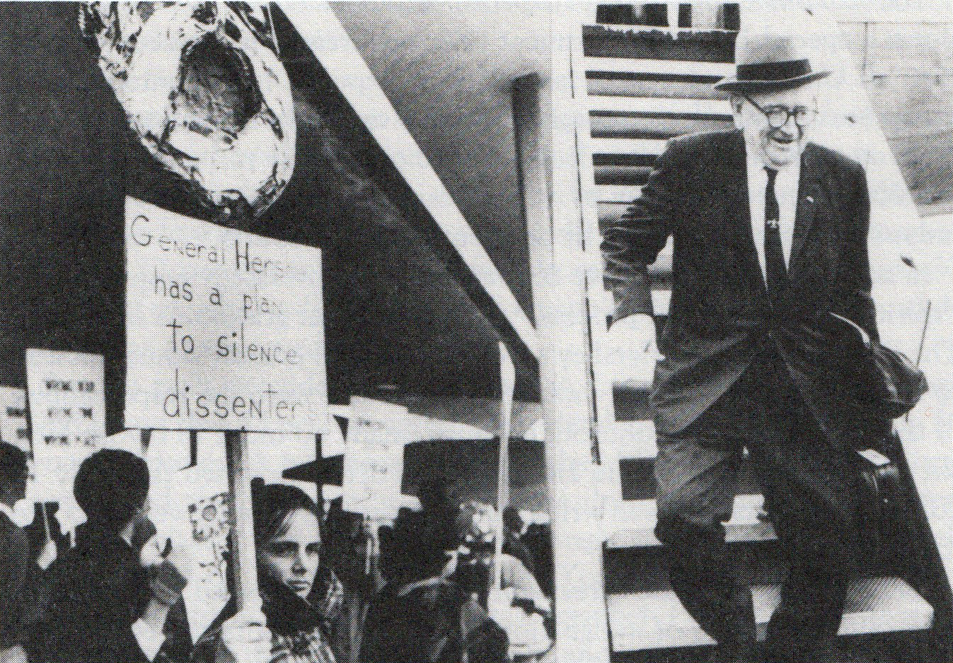 In October 1967 a crisis broke which had been brewing for two years. On October 15, 1965 a group of students and professors at the University of Michigan broke into the local draft board office and conducted a sit-in as part of a coordinated national protest. After thirty-nine hours, the police removed the protesters, arrested them, and charged them with trespassing. Shortly thereafter, Arthur Holmes, the Michigan state director phoned General Hershey and the two decided that the protesters should lose their student deferments and be reclassified I-A, ready for induction.³³ The decision represented the first time reclassification had been used as a punitive measure against draft protesters and set the dangerous precedent of using the draft as a tool of political censorship. Indeed, the move sparked protest from some quarters, including several congressmen and 101 law professors at nine universities who denounced Hershey’s actions as using the SSA — an administrative body — to execute a legal decision.³⁴